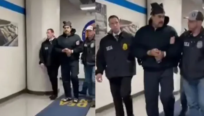 মাদুরোর হাত হ্যান্ডকাফ দিয়ে বাঁধা রয়েছে এবং তার চোখেমুখে ক্লান্তির ছাপ স্পষ্ট। তার বিরুদ্ধে মাদক-সন্ত্রাস, যুক্তরাষ্ট্রে কোকেন পাচার এবং অবৈধ অস্ত্র রাখার মতো গুরুতর অভিযোগ আনা হয়েছে।
