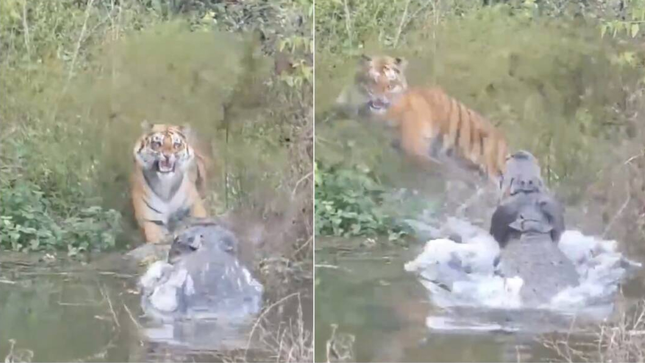 অল্পের জন্য কুমিরের হাত থেকে বাঁচল বাঘ